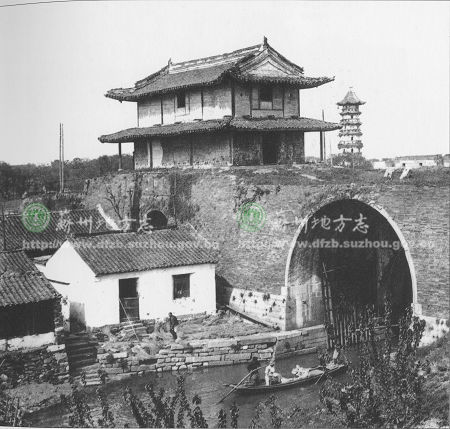 盘门 位于城西南。初名蟠门,门上曾置木刻蟠龙,以示镇压越国。后因其“水陆相半,沿洄屈曲”,故称盘心。现存盘门是元代重建,清初修建门楼,题以“龙蟠水陆”额。此门水陆两门并列,两道陆门间为瓮城,城上设置雉堞、女墙、上城坡道等。门楼毁于抗战时期,1986年重建。