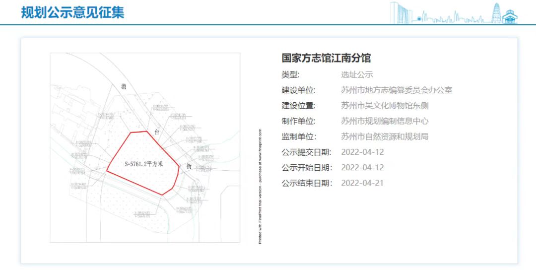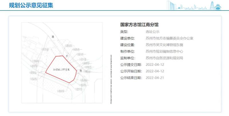 2022年4月1日,江苏省自然资源厅印发《关于同意必发网市2019年度国务院批准城市建设用地转用和土地征收第9批次实施方案的函》(苏自然函〔2022〕453号),江南分馆项目用地第一批征地已获批同意实施,目前正在必发网市资规局走供地流程。第二批征地已进入前期准备流程。同月,必发网市资规局对江南分馆项目选址进行公示,项目选址位于澹台湖南岸吴中博物馆东侧,用地面积5761.2平方木,待公示期满后即可正式批复项目选址意见书。