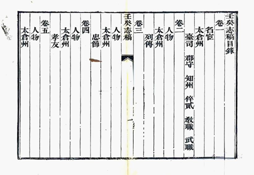《壬癸志稿》清咸丰三年(1853年)钱宝琛辑,为人物志。该志共二十八卷,卷一名宦,下设太仓州台司、郡守、知州、倅贰、教职、武职等分目;卷二至卷十八,分别为太仓州列传、忠节、孝友、文学、宦绩、耆硕、义行、隐逸、艺苑、技术、流寓、释道、杂传、列女、名媛;卷十九名宦,下设镇洋县知县、佐贰、教职;卷二十至卷二十八人物分别为镇洋县列传、孝友、文学、宦绩、耆硕、义行、列女、名媛。