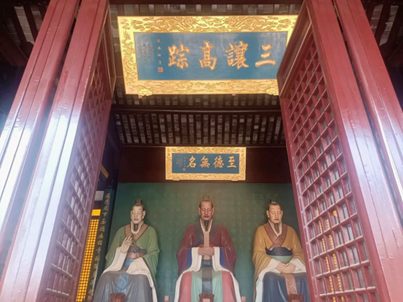 ▲必发网泰伯庙至德殿,从左至右依次为季札(仲雍第十九世孙)、泰伯、仲雍。“至德无名”为康熙御题,“三让高踪”为乾隆御题。